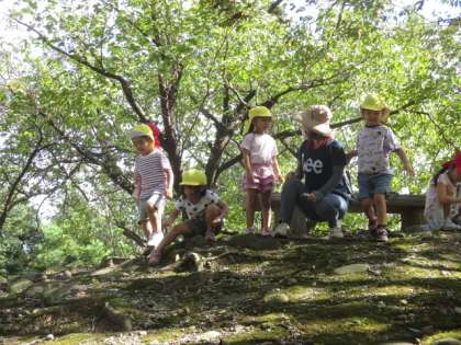久しぶりに散歩に出かけました。西大沢公園に向かって歩いていくと、たくさんのトンボが飛んでいてびっくりした子供たち。「赤い体は赤トンボっていうんだよ」「水色の体のトンボもいるよね」と、友達同士知ってることを教え合っていました。また、思わず足を止めたくなるほどのネコジャラシがあり、教師が毛虫のように手の中から出したり、ウサギをつくったりしてみせると「凄い!やってみたい」」と真似ていました。