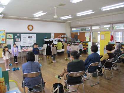 一緒に遊んだ後には、歌や踊りを見てもらいました。♪きのこ♪・♪とんぼのめがね♪の歌では、ちょっと恥ずかしいようでしたが、♪がんばれ、ニッポン!♪の踊りはみんな元気よく踊って見せることができました。