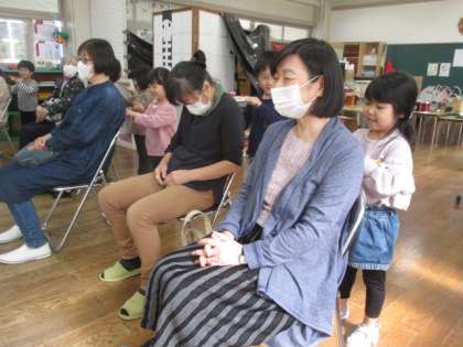 ♪モミモミマッサージ♪の曲に合わせて、おばあちゃんにマッサージをしてあげました。「気持ちいいわ」とニッコリ笑顔のおばあちゃん達でした。