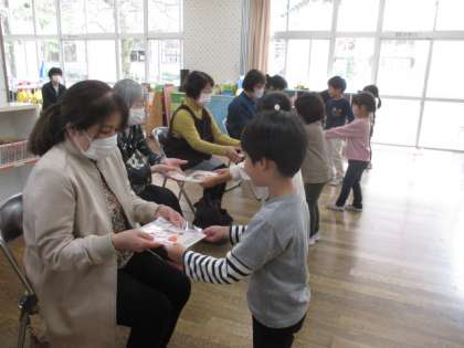 最後に子供たちから、マスクケースのプレゼントをしました。ぜひ、使ってくださいね。参観に来てくださった祖母の皆さま、温かく見守ったり、子供たちと一緒に遊んだりしてくださり、ありがとうございました。