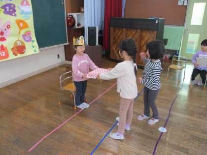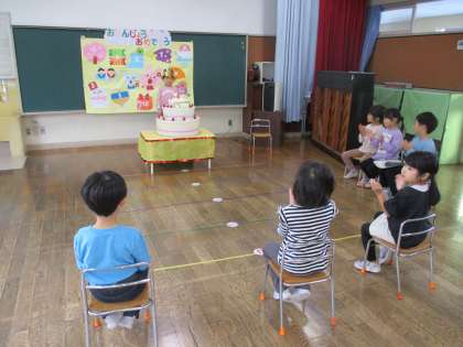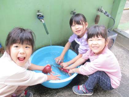 お楽しみコーナーは、楽しみにしていた『サツマイモパーティー』をしました!7日に収穫したサツマイモを自分たちできれいに洗い、園長先生に食べやすい大きさに切って、ホットプレートで焼いてもらって食べました。「白いのと黄色いのあるけど、味は同じだね」「甘くておいしい〜!」と、喜んで沢山おかわりして食べていましたよ。
