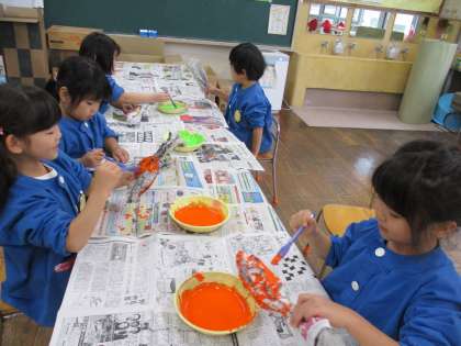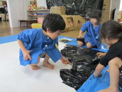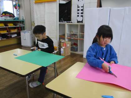 なかよし発表会に向けて、劇の背景を描いたり、小道具をつくったりしました。「宇宙って真っ暗だよね」「おいしいニンジンをつくろう」と劇で使うものを楽しみながらつくりました。