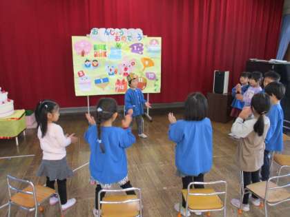 11月生まれのお友達の誕生会をしました。みんなで「おめでとう」と言ったり、歌を歌ったりしてお祝いしました。