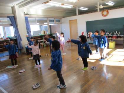 お楽しみコーナーでは『新聞紙じゃんけんゲーム』をしました。じゃんけんをして負けると、自分が乗っている新聞紙を半分ずつ小さくしていきます。どんどん新聞紙が小さくなっていくと「次は絶対にじゃんけんに勝つぞ」「片足立ちで新聞紙に乗れば小さくても大丈夫だよ」などといろいろ考えていました。