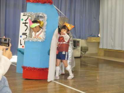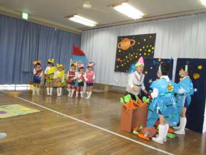それぞれの役になりきったり、運動遊びに取り組んだり、大道具を動かしたり...一人一人が自分の役割を精一杯に務め、素敵な劇になったと思います。演技後には「ロケットで動いたときに、パパとタッチできて嬉しかったよ」「ママたちに見てもらえて、楽しかった!」という声が聞かれ、子供たちも満足したようで、担任としてもほっとしました。緊張しながらも、最後までよく頑張りました。