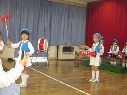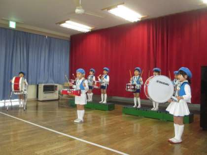まずは、全園児による鼓隊演奏。年長児によるマーチングバンドで入場し♪恋♪の曲に合わせて、大太鼓・中太鼓・小太鼓・ティンプトンで演奏しました。太鼓の重さにも慣れ、「ドン・ドン・たいこ…」と声に出して言い、楽しみながら、みんなの気持ちを一つに演奏することができました。