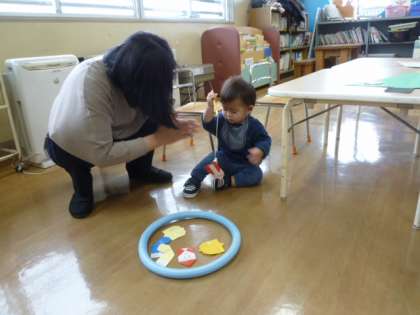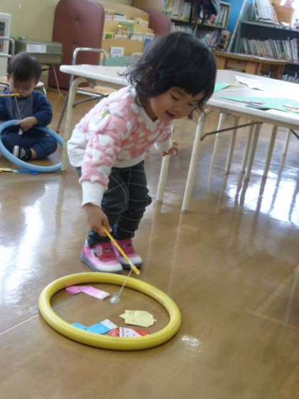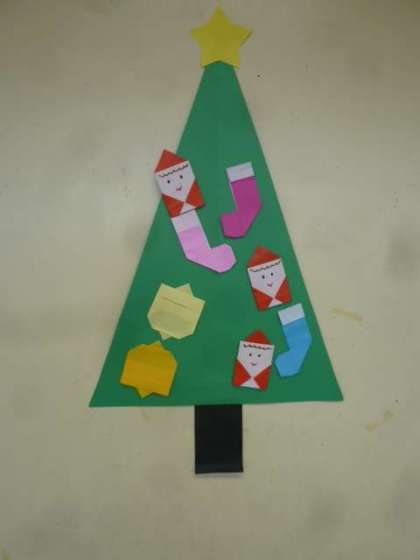 折り紙のサンタさんやブーツを、ママと一緒に魚つりのように釣って大きなツリーにつけました。
