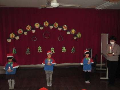 うさぎ組のキャンドルサービスでは、園長先生から神様の火を分けてもらい、3人がそれぞれ誓いの言葉を言いました。暗い保育室では、キャンドルに灯った火がとても輝いて見えましたよ。