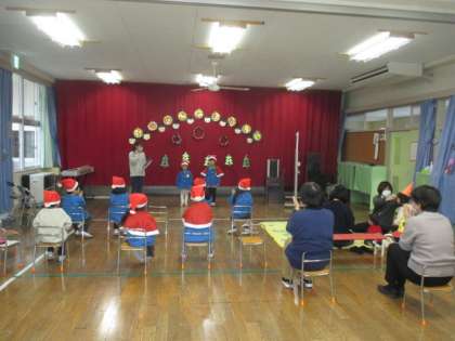 待ちに待った冬の子供会。子供たちは三角帽子を被って「サンタさん来てくれるかな」「雪がないけど、ソリに乗れるのかな」と、朝からドキドキしていました。