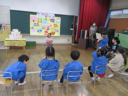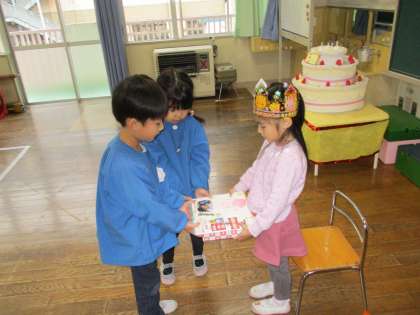 12月生まれの友達の誕生会があり、みんなで「おめでとう」と言ったり、歌を歌ったりしてお祝いしました。5歳になった友達は「大きくなったら、アイスクリームやさんになりたい」と話してくれました。元気に大きくなってね!