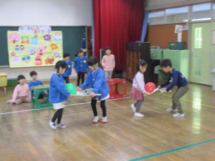 お楽しみコーナーの『風船運びレース』では、赤チームと白チームに分かれ、友達と一緒に、新聞紙で風船を落とさないように慎重に運んでいました。風船はふわふわしていてちょっと運びにくいようでしたが、友達と力と心を合わせてレースを楽しみました。