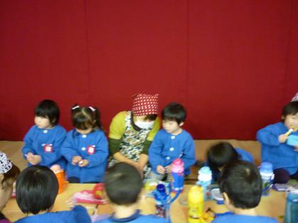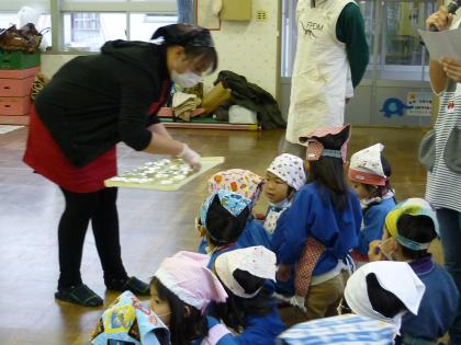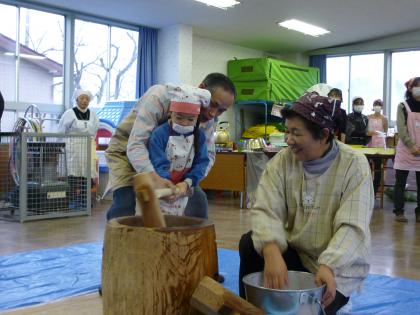 12月9日(木)もちつき会をしました。始めは蒸したてのもち米を食べました。お餅になる前のご飯は口の中でよく噛むとお餅になり「段々お餅になってきた」と嬉しそうに味わって食べていました。園児の祖父母の方にお手伝いしていただき臼と杵でお餅をつきました。「よいしょ。よいしょ。」と掛け声をかけみんなもお手伝いをしました。年長児はおじいちゃんと一緒に餅つきの体験もしました。憧れの杵を持ちお餅がつけて大満足そうでした。