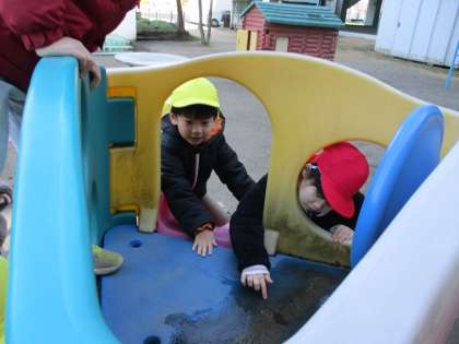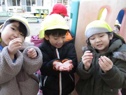 そこで、外へ行って冬さがしをすることになりました。早速園庭の遊具の水たまりが凍っているのを見付けると「氷ができてる!」「冬を見付けたよ!」と、大喜び。氷が割れないようにそっと手に取ると「つめ〜い!」「大きい氷ゲット!」と、大興奮でした。木々の雪囲いも見付け「雪囲いって言うんだね...」と、興味津々な姿も見られましたよ。