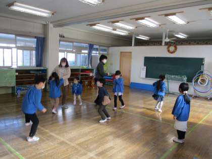 お楽しみコーナーでは、みんなで『誕生月のうた』を踊りました。自分の誕生月の出番が来ると、少し恥ずかしそうにしながらも、円の中央まで行き、手や足を曲げ伸ばしたり、クルクル回ったりして、オリジナルの振りで踊る姿が可愛らしかったです。