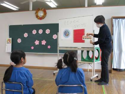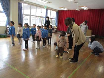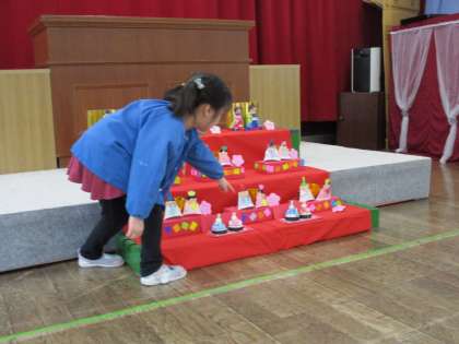 わくわくルームに自分たちでつくったひな人形を飾り、親子サークルの友達と一緒にひなまつり会をしました。園長先生からは、ひな人形のシルエットクイズをしながら由来の話を聞いたり、みんなで歌を歌ったり、ゲームをしたりして楽しみました。ひな人形紹介では、年長児が「紙粘土で、人形の指などこまかいところをつくるのが難しかった」年中児が「千代紙で着物を折るのが難しかった」と話してくれました。