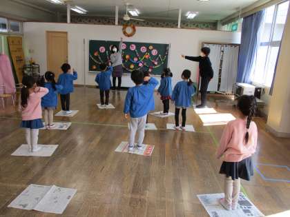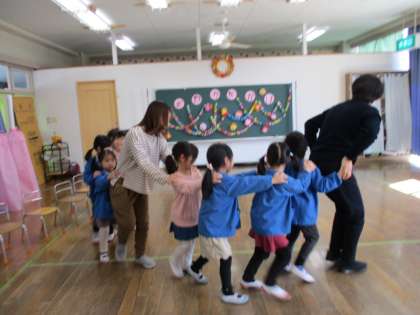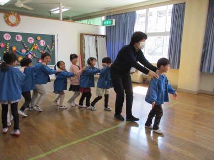 続いての『貨物列車』では、1回目はひまわり組の友達列車になり、2回目は園長先生列車になりました。あっという間に、長い列車が出来上がりました。