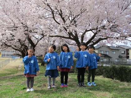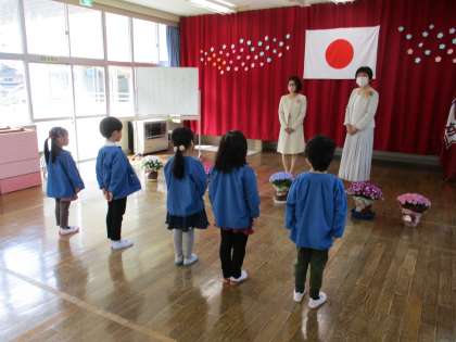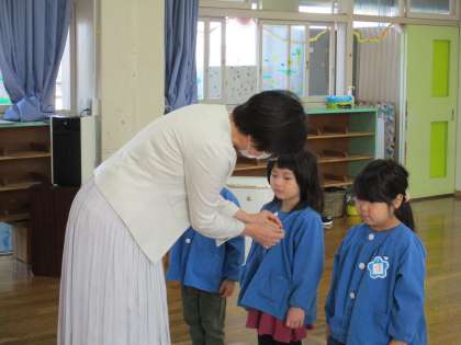 新しい先生を迎え、令和4年度1学期が始まりました。始業式で、新しい年長組の名札を園長先生に一人一人つけてもらうと進級の嬉しさでいっぱいの子供たちでした。園長先生から「”いい耳・いい目・いい口・いい体”でいろいろなことにみんなで挑戦し、ピカピカの笑顔で元気に過ごしましょう」とお話があり、新しい生活に期待が膨らみました。
