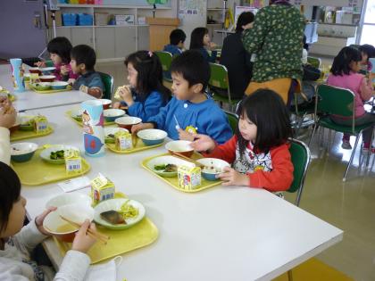 1月21日(金)に大沢野小学校のランチルームで、幼稚園、保育所、小学校1年生の交流給食がありました。初めに教頭先生のお話を聞いたり、栄養士の先生のお話を聞いたりしました。1年生になったらどのように給食の準備をするのかスライドも見せてもらいました。その後1年生のお当番さんに配膳をしてもらい自分達で給食の準備をしました。緊張しながら給食を食べ始めた子供たちでしたが次第に緊張もとけ、おかわりするほど食べてきました。小学校へ行っても安心して給食が食べれそうです。