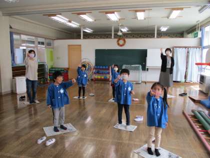 お楽しみコーナーでは『新聞じゃんけんゲーム』をしました。先生とじゃんけんをしてあいこと負けの友達は新聞をたたんでいき、最後まで新聞の上に乗っていることができた友達が勝ちになるゲーム。チャンピオンを目指して頑張っていました。