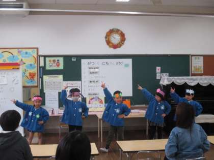 朝の会では、少し緊張しながらも名前を呼ばれると大きな声で返事をしていました。歌を歌い、自分でつくったお面をかぶり踊りを披露しました。いつもはノリノリで踊っているのですが、今日は表情が硬く…「お母さん見ていると恥ずかしかった」と照れ笑いしていました。