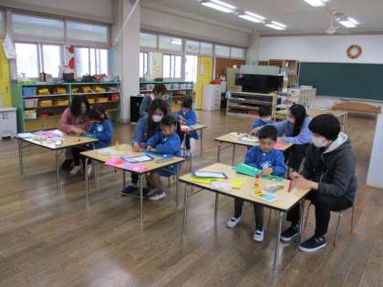 こいのぼりの製作をしました。年長組になったので少し難しいつくり方に挑戦しました。心配そうに見守るお母さん達でしたが、子供たちは楽しみながらつくっていました。