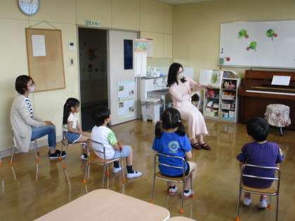 その後♪かえるのうた♪で初めて輪唱をしました。旋律をずらして追いかけて歌うことが難しかったのですが、繰り返しやってみることでうまくでき、歌い方に変化がある音楽を楽しみました。