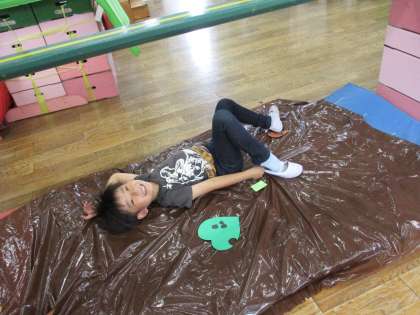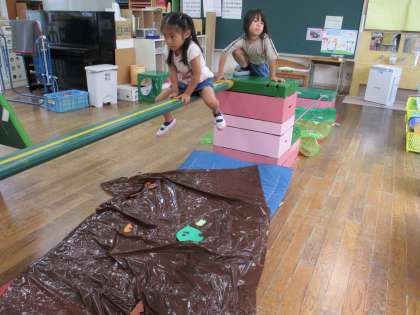 丸太渡りの下は、土とか草とか落ち葉があるといいと言ってカラーポリ袋を張り合わせ、落ち葉を散りばめていました。毛虫もいるので、丸太から落ちると危険です!