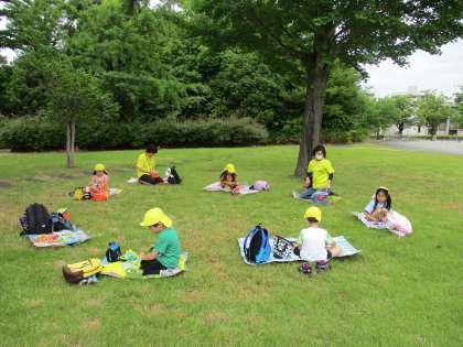 たくさん遊んだ後は、お待ちかねの弁当タイム。今日はおやつもOK!城南公園芝生広場でおいしくいただきました。