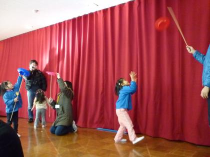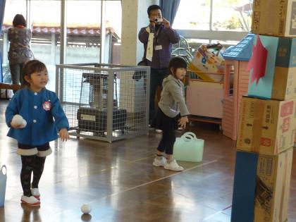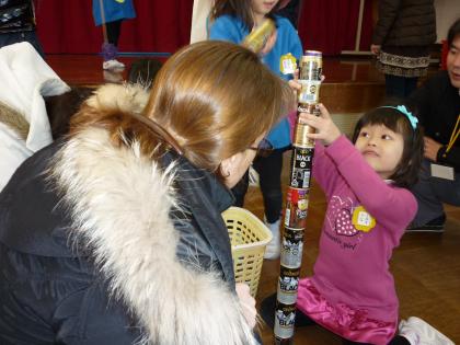 2月19日(土)保育参観がありました。今回は日頃子ども達が幼稚園で遊んでいる遊びを親子で楽しんだり、新しい遊びにチャレンジしたりするハッピーランドで遊びました。遊戯室では、『かいじゅうやっつけろ』というダンボール崩しや空き缶タワー(缶積み)や羽根つきや皿回しがありました。『かいじゅうやっつけろ』では、なかなかかいじゅうが倒れなく最後の大きなボールでダンボールが崩れ大喜びの子ども達でした。皿回しや羽根つきも盛り上がっていました。