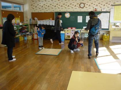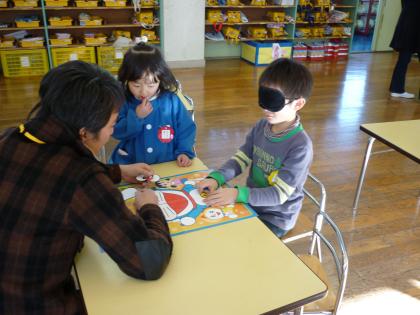 うさぎ組ではこま回しや福笑い、紙鉄砲作りがありました。昔を思い出しこま回しに夢中になるお父さんもいて親子で楽しく過ごせました。