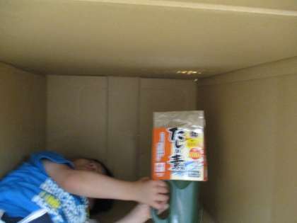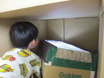 段ボールや空き箱にアルミホイルや透明シートに色を塗って貼り付け、下からライトを当て大きな段ボールに映してみました。「あっ、星ができた」「きれいだよ」「すごい」と驚いたり喜んだりしていました。