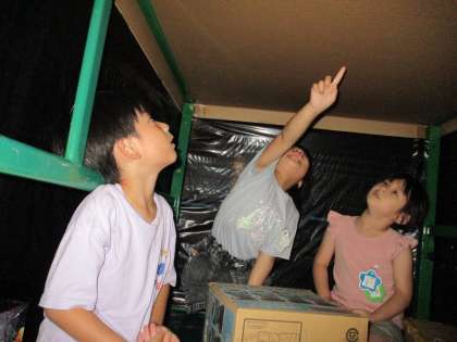 「私もつくってきたよ」とおじいちゃんに手伝ってもらってつくったプラネタリウム(段ボール)を持ってきた女児。頭にかぶると星が見えるのを友達にやって見せていました。