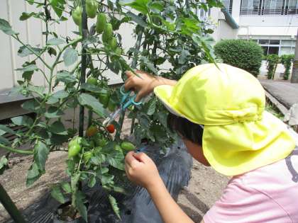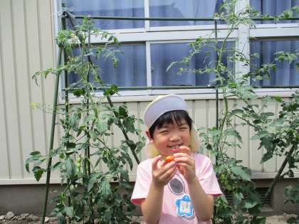 収穫第4号!「次は僕が収穫したいな」と楽しみにしていた男児が赤く色付いたトマトを収穫しました。トマトを手に嬉しそうに「お母さんに見せてあげたい」と家に持って帰りました。さあ、お味はいかが…。