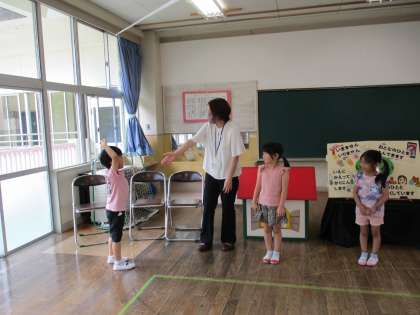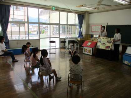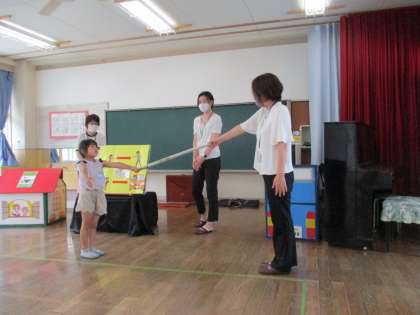 大型絵本や紙芝居を見ながら、自分を守る大切さをわかりやすく教えていただきました。また、実際に知らない人に声をかけられたときにはどうしたらよいのかやってみました。知らない人から離れたり「(一緒に)行かない」と断ったりすることができました。