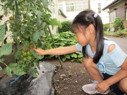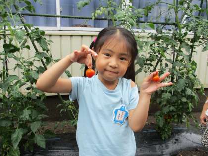収穫第5号!色付いたトマトを見た女児が「やったー、私も収穫だ!」と喜んで収穫しました。「甘いトマトだったらいいな」と家に持ち帰りました。さあ、お味はいかが…。