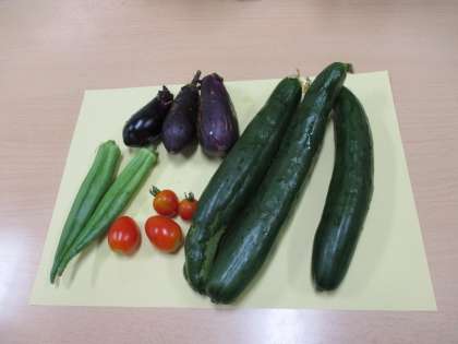今日は、キュウリ・オクラ・ナス・トマトとたくさんの収穫物がありました。