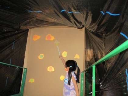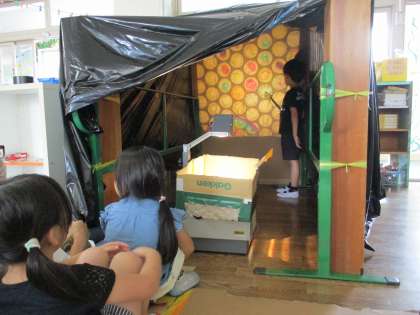 先月、プラネタリウムを観覧してから、みんなでうさぎ組のプラネタリウムをつくろうと取り組んできました。それぞれのプラネタリウムや座席が完成し、いよいよ上映会です。