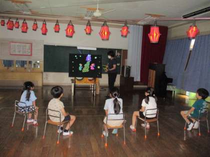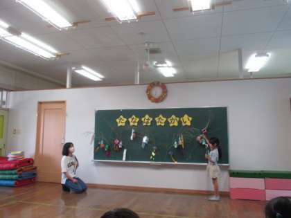 「家族で旅行に行けますように…」「縄跳びで後ろ跳びが100回できるようになりますように…」などと、みんなで短冊に書いた願い事を紹介し合いました。七夕の由来については、園長先生がブラックシアターでお話をしてくださいました。絵が光って見えることが不思議でお話の世界に引き込まれていました。