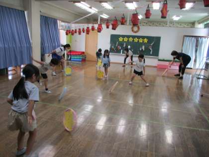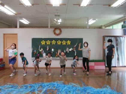 フラフープに画用紙で星をつけ、それを合図に合わせてみんなで回し、一番長く回りつづけた星が勝ちというゲームです。色を塗ったり模様を描いたりした星(フラフープ)を回すときれいに見えるのも楽しんでいました。