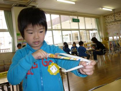 色々な模様のこまを工夫して作ったり、広告の紙でロビンフッドのような弓矢を作ったり・・・