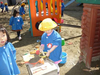 迷子にならないように幼稚園の帽子をかぶってお庭遊び。