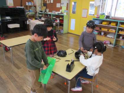 劇のお面はどうするか相談しました。「アリやキリギリスの顔を書いて色を塗ったらどうかな」「帽子みたいなのがいいな」と…。みんなで帽子のような被り物のお面をつくることになりました。自分の頭のサイズに合わせて工作紙で帽子をつくり、カラーポリ袋で覆い、モールの触角を付けました。カラーポリ袋の貼り方で形が変わり、オリジナルのお面ができました。