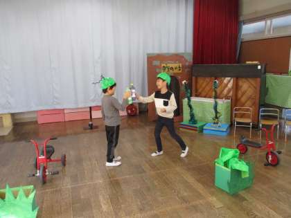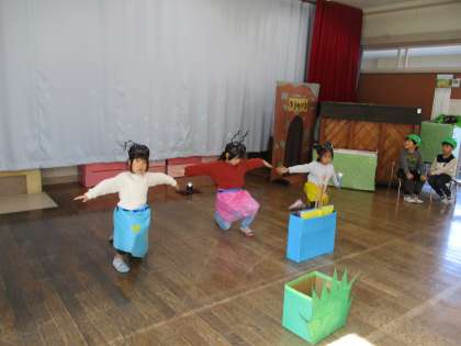 「発表会はここでやるんだよね」「大きな声でセリフを言わないと聞こえないね」とわくわくルームでの劇練習が始まりました。初めてのステージ練習でしたが、いつも通りに自分の役を楽しんでいました。