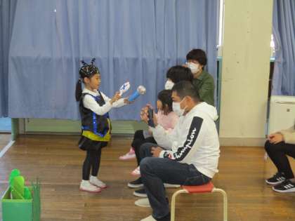 暑い夏の間もたくさん食べ物を集めていたアリさんも『クイズタイム』で楽しませてくれました。『大沢野幼稚園は何歳でしょう』(答え50歳)などみんなで考えたクイズ、お客さんに難しい問題もありましたね。
