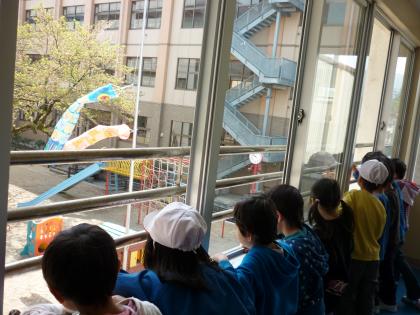 「わっ」と歓声があがり、「なんか高く上がったら、小さく見えるね」「風強くてかわいそう」「踊っているみたい」「かっこいいね」などなど、二階の窓から揃って自分たちのこいのぼりに心を寄せている子どもたちでした。