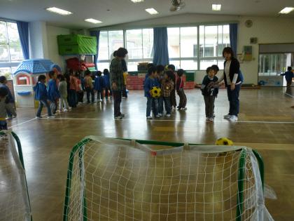 今日のこいのぼり集会では、年少さんは平均台の一本橋渡りに、年中組さんはバスケットボールに、年長組さんはサッカーに挑戦しました。