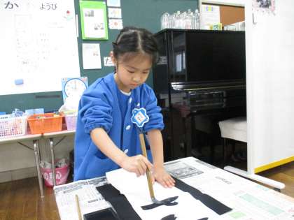 今年の干支「うさぎ」を書きました。習字の筆を使うのは初めてで「ちょっとドキドキする」「難しそう」と言いながら書いていました。