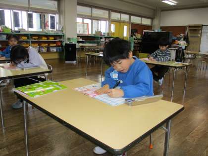 よい姿勢、正しい鉛筆の持ち方、文字の書き順に気を付けながら、一文字一文字丁寧に書いています。「お母さんの名前の字だ。頑張って書くよ」「この字難しい」と言いながら、文字・数のワークに取り組んでいます。