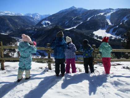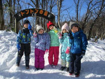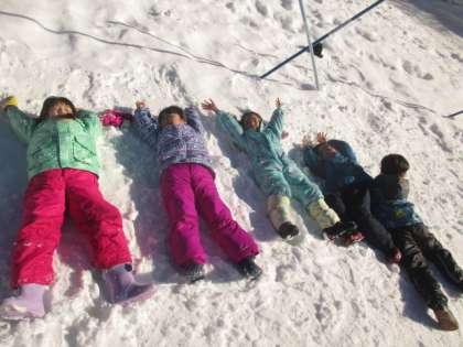 到着後、まずは、雪の上に寝転んで雲の様子を見たり、森を散策して、動物の足跡を見つけたり、絶景ポイントで「やっほー!!」と大きな声で叫んだりしました。