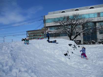 雪が固まっていたので、そりのスピードも出て面白かったですよ。尻滑りをしたり、寝転んでゴロゴロ転がったりして楽しみました。